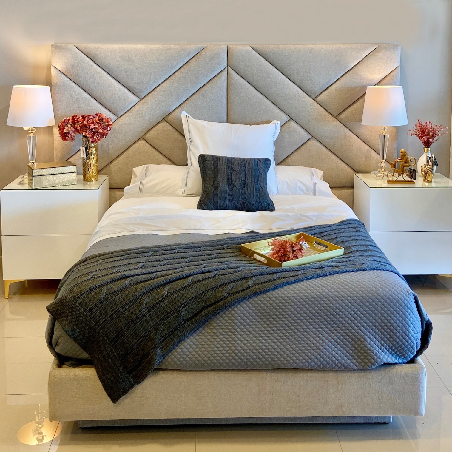 – Diseño Atractivo: Cabecero tapizado con un patrón geométrico que añade un estilo único y moderno.